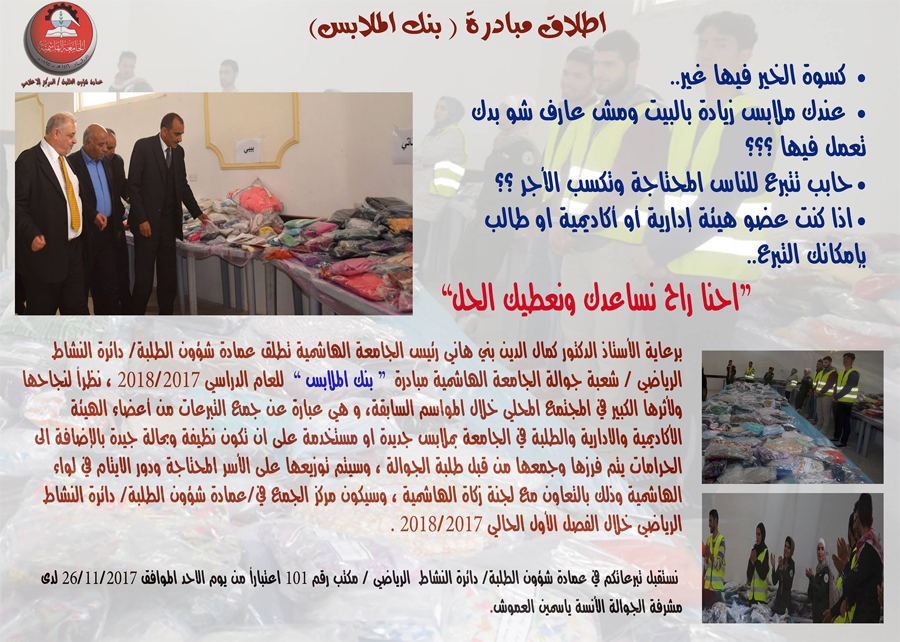 الثلاثاء, كانون الأول 12, 2017عدد المشاهدات: 884 برعاية الاستاذ الدكتور كمال الدين بني هاني رئيس الجامعة ..عمادة شؤون الطلبة تطلق مبادرة" بنك الملابس " في موسمها الثالث.