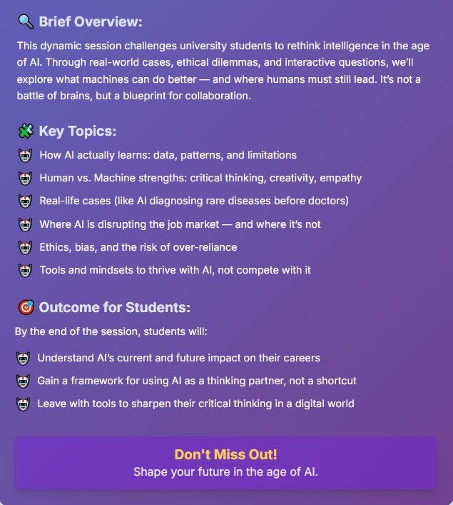 انضموا إلينا في ندوة ثرية مع الدكتور محمد خواجا، حيث نستكشف مستقبل الذكاء الاصطناعي، وتأثيره على المهن، وكيف يمكن للبشر أن يزدهروا جنبًا إلى جنب مع الآلات!