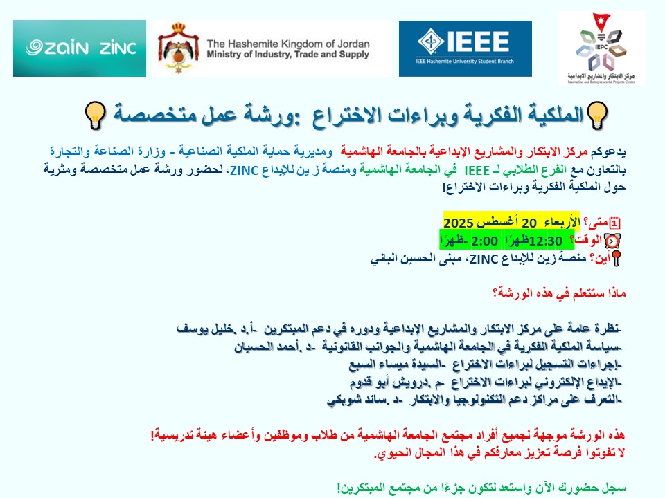 يسر مركز الابتكار والمشاريع الإبداعية في الجامعة الهاشمية ووحدة دعم التكنولوجيا والابتكار - مديرية حماية الملكية الصناعية - وزارة الصناعة والتجارة ، وبالتعاون مع الفرع الطلابي لـ IEEE في الجامعة، ومنصة زين للإبداع ZINC، دعوتكم لحضور ورشة عمل متخصصة ومثرية بعنوان: