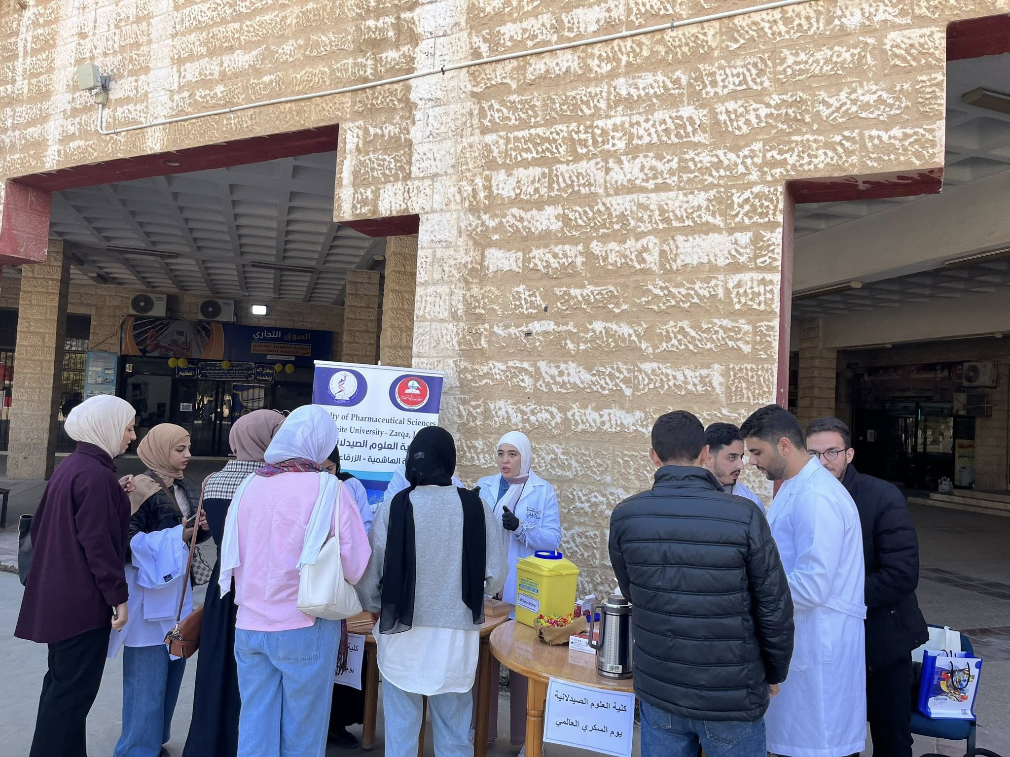 بمناسبة اليوم العالمي للسكري، نظّمت كلية العلوم الصيدلانية في الجامعة الهاشمية فعالية صحية شملت محطات لقياس نسبة السكر في الدم وتقديم التثقيف الصحي لطلبة الجامعة والعاملين فيها، وذلك بالتعاون مع مستودع الإيمان للأدوية.