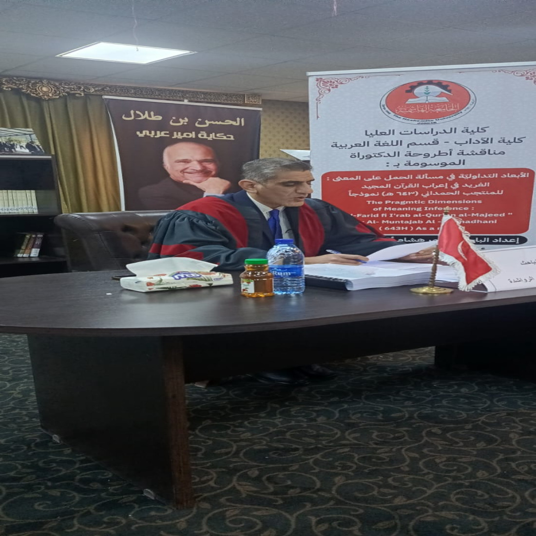 نوقشت في ركن الأمير الحسن في مكتبة الجامعة الهاشمية يوم الأحد الموافق 11/1/2026 أطروحة دكتوراه بعنوان ( الأبعاد التداولية في مسألة الحمل على المعنى: الفريد في إعراب القرآن المجيد للمنتجب الحمداني (643هـ) نموذجاً ) من اعداد الباحث عمر الرواشدة وبإشراف الأستاذة الدكتورة ايمان الكيلاني (رئيساً).